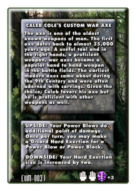 Caleb Cole is a Removal Immortal. He can use his Persona Power to remove his opponent's cards from the game. He also has a custom War Axe that gives him extra Strength as well as a less burdensome downside for the War Axe. He is one of 4 immortals who has a Master's Disarm in the game, giving him a unique advantage over most other immortals.