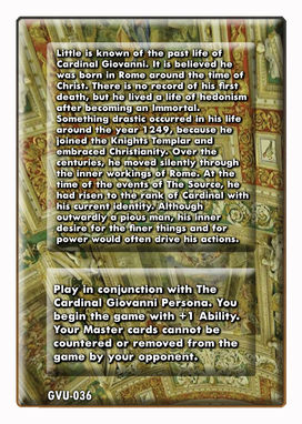 Around this same time, Giovanni became Immortal; circumstances and location unknown. After becoming Immortal, Giovanni gloried in his new life, amassing a fortune and wallowing in excess. But as he rose in power and stature, his own resurrection started to weigh heavily on his mind, and he began to believe that God has chosen him to be His “messenger.”