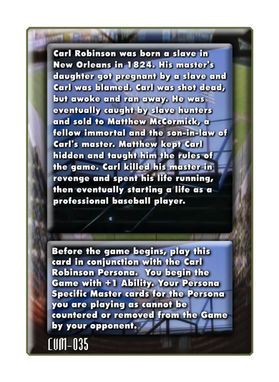 Carl Robinson was born in 1824 in New Orleans as a slave. In 1859, Carl's master, Seth Hobart, took his daughter out to the field's. Pregnant, she had apparently claimed she had been raped by one of the slaves. She randomly pointed out Carl as the guilty party. Hobart immediately shot Carl. Carl revived shortly as an Immortal.