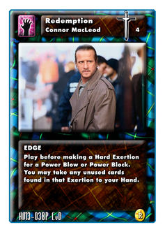 Connor MacLeod currently has 3 different Personas in Highlander the Card Game 2nd Edition. Two personas makes use of Allies and allows him to control exertion size and get around discard/restriction effects. Connor's alternate persona allows him to Ignore Restriction Effects. Connor has his own Katana which does not count towards his Pregame limit which allows him to have more than 6 Pregame cards.