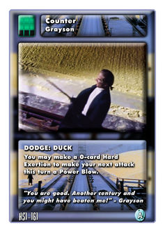 Grayson's power in Highlander the card game is based around Burn. He can force his opponent to Burn cards from the top of their endurance in various situations, depleting their ability to get cards they need into their Hand.