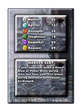 Haresh Clay can use his Persona Power in Highlander the Card Game to make attacks he plays undodgeable. He was designed to use the Nimcha Weapon of Choice, but he pairs well with many other weapons like the English Longword (Appel) and the Katana (Lunge). He also runs smoothly with a Dirty Trick based deck as those can't be blocked.