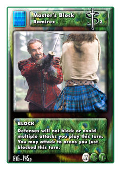 Ramirez is a cost based immortal in Highlander the card game. He can run 12 slashes in his deck (one of the only instances in the game where you can have more than 6 of any one card type) and anytime his opponent plays a dodge from their Hand, they must discard a dodge. While it may seem like he is built as a single attack immortal, you can use his hilt to turn him into a multi attack theme.