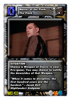 A gang of Immortals who served Jacob Kell in his quest for revenge against Connor MacLeod known as the Flock. Seduced by his charismatic spell, they followed him like a religious leader. They were comprised of Faith, Jin Ke, Cracker Bob, Winston, Carlos and Manny.